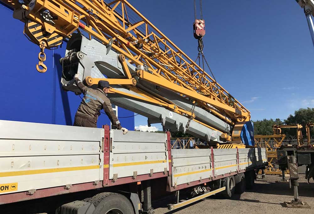 Если кран вывозится с территории завода, где он собирается и отправляется на строительную площадку или строительный объект, чаще всего задействуют железнодорожные пути. Чтобы упростить погрузочно-разгрузочные работы, для подъёмных машин применяют открытые платформы