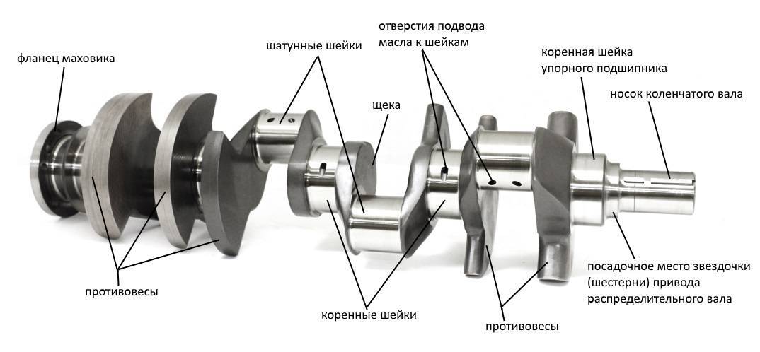 Коленчатый вал складывается из шеек (коренных, шатунных), щек (соединяющих шейки) и противовесов. Щеки создают равновесие при работе всего механизма. Внутри шейки и щеки оснащены небольшими отверстиями, через которые под давлением происходит подача масла.
