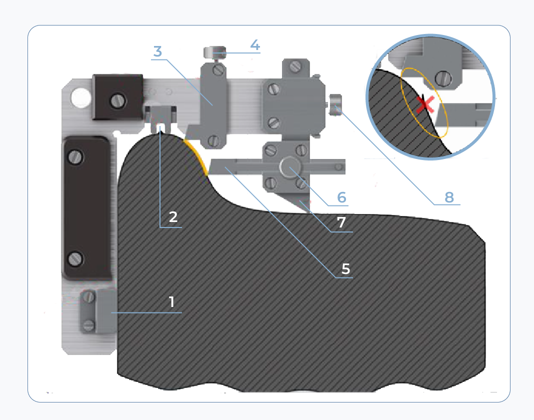 | 1 – опора 2 – паз для определения наплыва 3 – движок с верхним упором 4 – стопорный винт движка 5 – нижний упор 6 – стопорный винт нижнего упора 7 – планка 8 – стопорный винт планки |