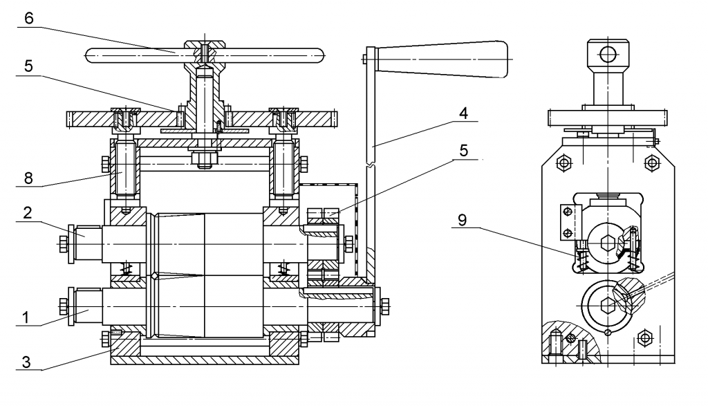 Для изготовления валковой машины своими руками вначале необходим чертёж общего вида станка, где следует изобразить кинематическую схему перемещения всех его подвижных частей. Потребуются также чертежи сборочных единиц и рабочие чертежи ненормализованных деталей трёхвалкового листогиба. Желательно, чтобы таких деталей было поменьше, поскольку сделать многие из них в домашних условиях, и своими руками затруднительно, а то и вовсе невозможно. В частности, есть смысл подыскать направляющие круглого поперечного сечения, например, от списанного токарного станка 1К62 или более мелкого: их техническое состояние вполне позволит использовать данные детали под опорные валы листогибочных вальцев. То же касается шестерённой пары. Далее, под имеющиеся детали можно уточнить характеристику будущих трёхвалковых вальцев и сделать подбор подшипников качения для всех валов.