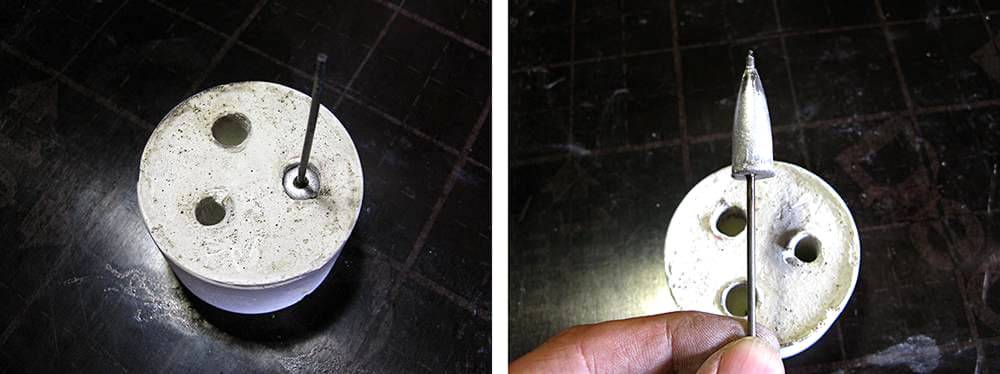 - В гипс до половины погружается нужное грузило и с помощью сверла, сбоку от заготовки, в гипсе делается отверстие для заливки свинца (в эти отверстия лучше вставить подходящие по размеру цилиндрики);