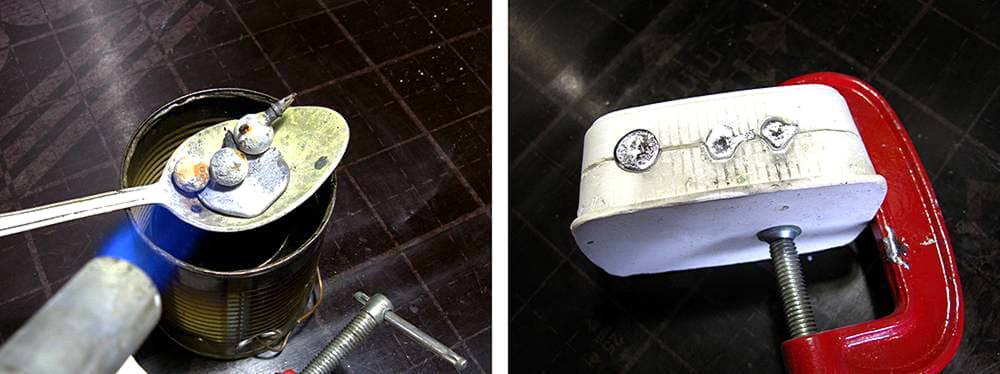 Процесс отливки грузила прост: плотно прижать друг к другу обе половины формы струбциной, расплавить свинец, аккуратно, тонкой струйкой залить его в форму и подождать, пока расплавленный металл застынет.