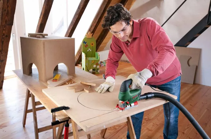 Далее, лобзик выключают и ставят подошвой на материал. Потом его снова включают и медленно без чрезмерного надавливания продвигают к разметке, по которой осуществляют выпиливание нужной детали.