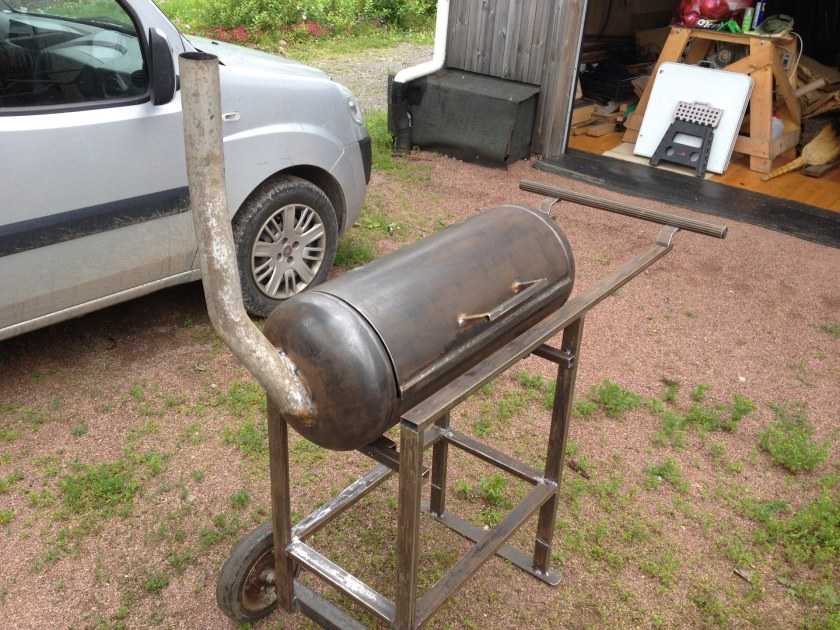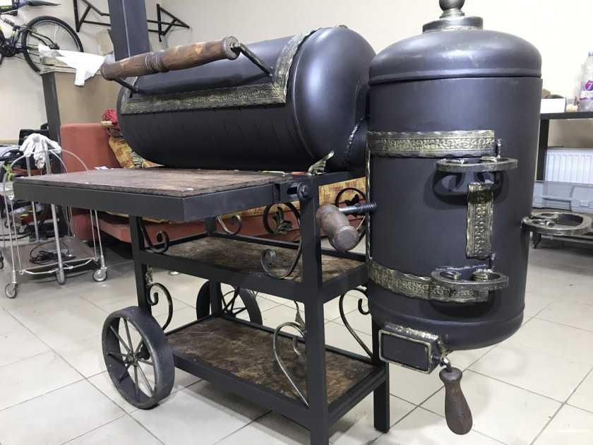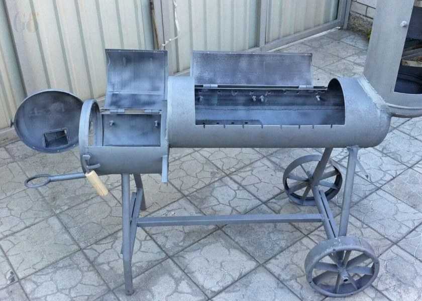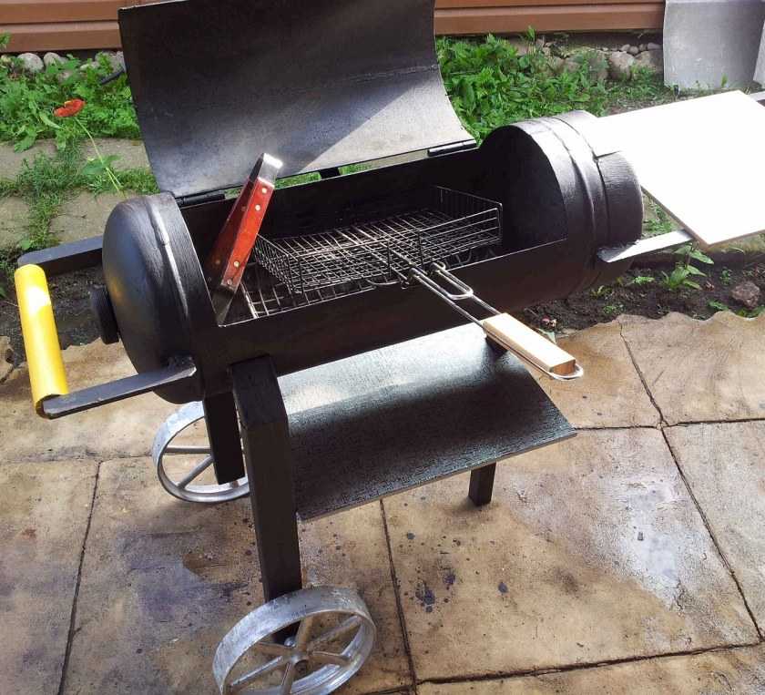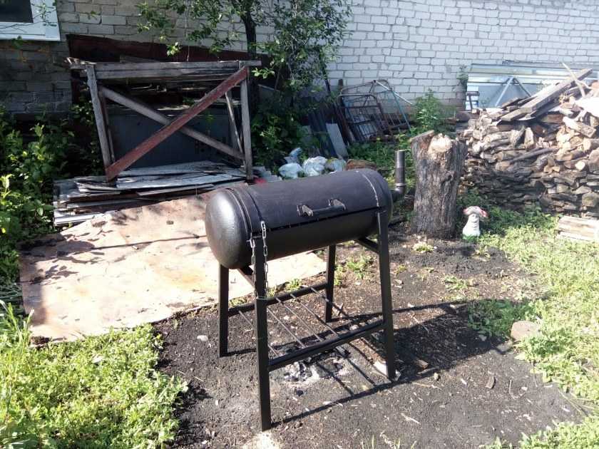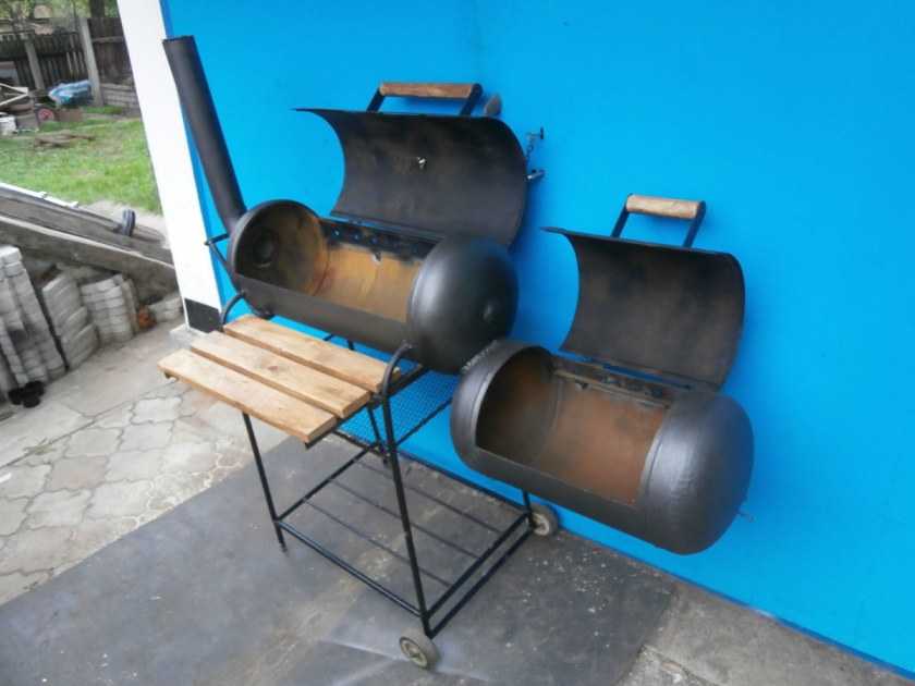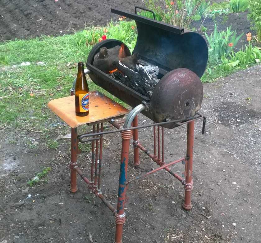Самый простой вариант — это разрезать емкость на две части, к каждой приварить ножки, и получится два хороших открытых мангала. Но функционал ограничен и внешний вид не очень привлекательный. И в любом случае нужно устанавливать его на ножки, чтобы удобно было готовить. Как вариант — приварить поперек две трубы, чтобы ставить конструкцию на землю. Но сидеть возле жаровни на корточках неудобно, особенно если нужно много готовить пищи. Поэтому мангал своими руками лучше сделать полноценный, с функцией коптилки и всеми возможными мелочами, полезными при эксплуатации. Прежде чем приступать к изготовлению, рассмотрите фото конструкций, подберите для себя наиболее привлекательный вариант.