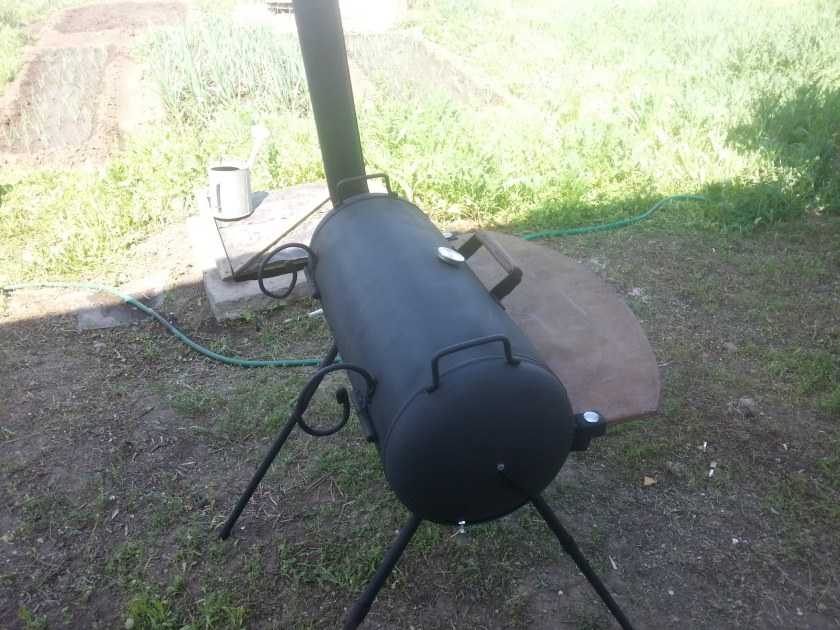После сверления отверстий изготовление мангала может считаться законченным. Хорошенько почистите его и протопите несколько раз, чтобы запах газа полностью выветрился. Что касается краски, то это необязательный этап. Одни хозяева красят термостойким покрытием, другие пропускают этот шаг. Все равно через несколько обедов с хорошим шашлыком мангал закоптится и будет черным. Для повышения тяги рекомендуется установить дымоход: в торце конструкции мангала вырезается круглое отверстие, куда можно приварить обычную водосточную трубу подходящего диаметра.