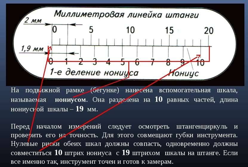 - Количество целых миллиметров отсчитывается по шкале штанги слева направо. Указателем служит нулевой штрих нониуса.