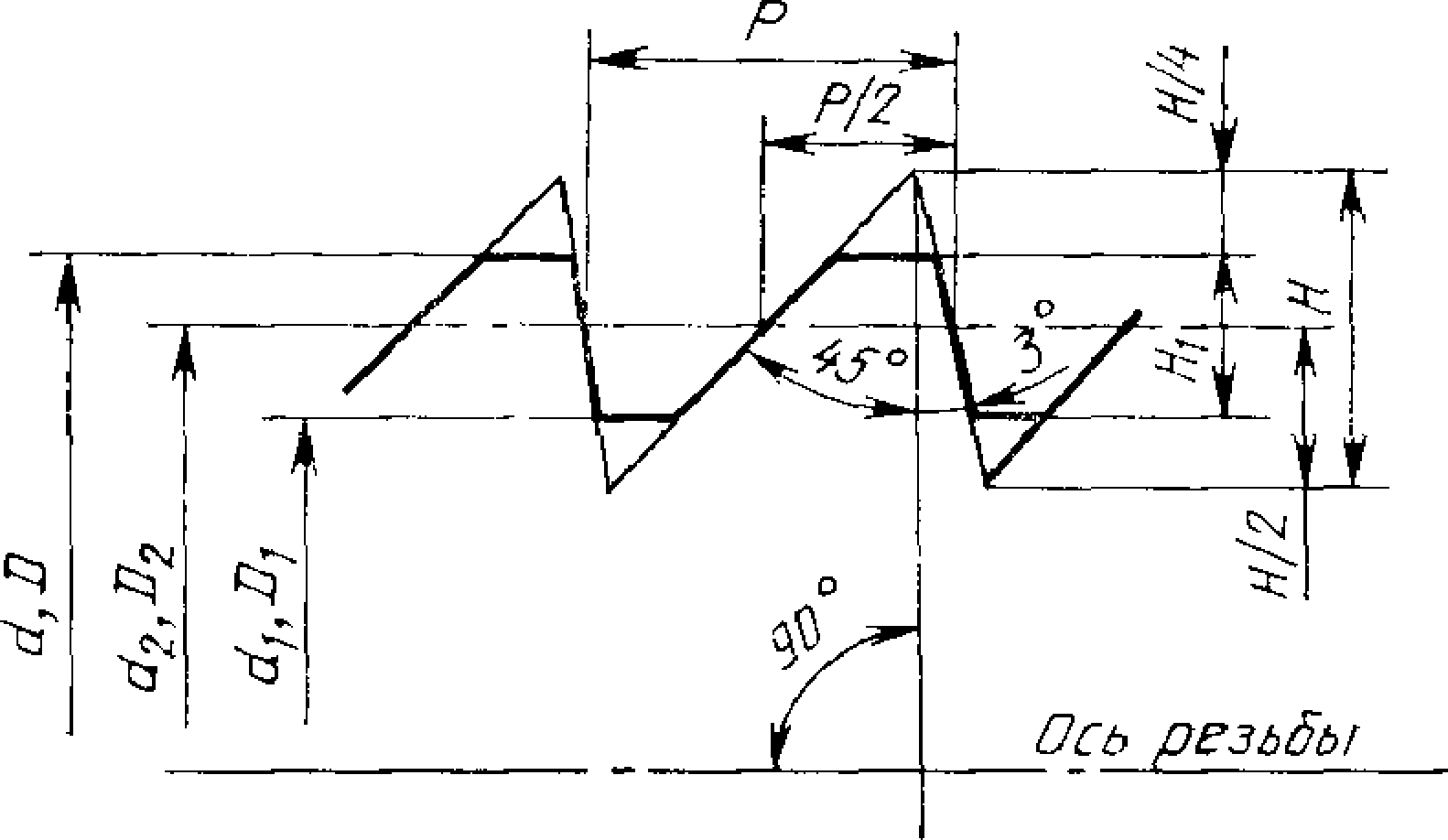 Средний диаметр резьбы в зависимости от ее наружного или внутреннего расположения обозначается буквами D2 и d2.