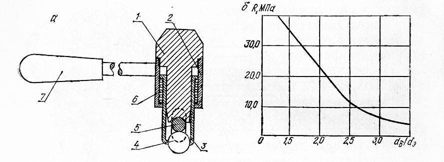После этого при помощи штангенциркуля и специальной линейки производятся измерения диаметров лунок. Каждое измерение производится с точностью до десятых долей миллиметра сначала в одном направлении лунки, затем в строго перпендикулярном. На основании полученных сведений и данных о диаметре отпечатков лабораторных образцов, взятых за стандарт, составляется тарировочная кривая, позволяющая произвести определение прочности бетона на сжатие.