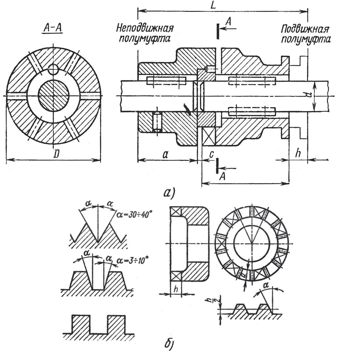 Наиболее простая конструкция муфты с прямоугольным профилем кулачков показана на рис. 8, а; соотношение размеров ее таково: наружный диаметр D ≈ 2,5d; длина ступицы неподвижной полумуфты l 1 ≈ 1,5d, то же подвижной l2 ≈ (2…2,5)d; осевой зазор е ≈ 5…10 мм; число кулачков z=3…5; высота кулачка h ≈ (0,3…0,5)d. Полумуфты должны строго центрироваться на валах, для точности расположения которых служит втулка в одной из полумуфт.