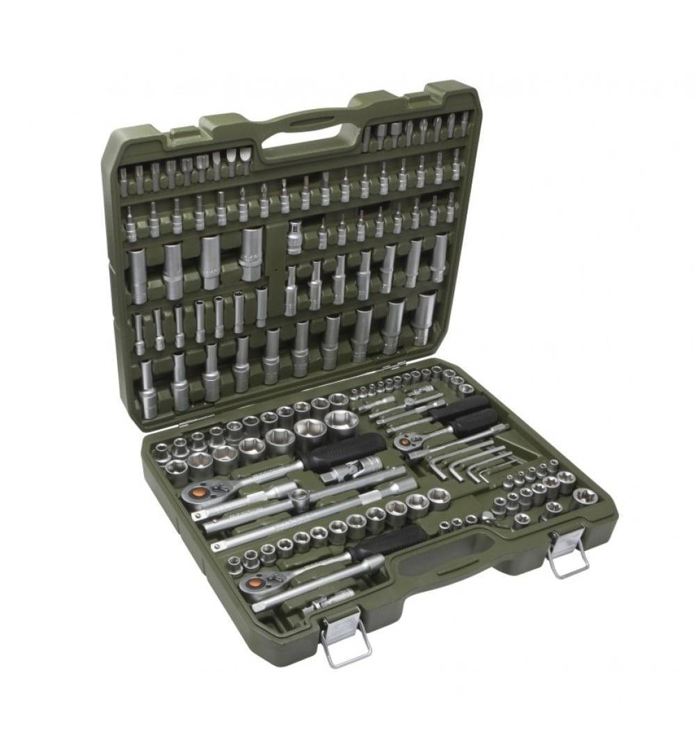 Этот набор инструмента подкупает богатой комплектацией и скомпилирован исключительно для нужд автомобилистов. Кроме стандартных головок и ключей, приводов и бит, в комплект входят бокорезы, пассатижи среднего размера, разводные клещи, магнитная телескопическая ручка, 4 отвертки, а также автотестер. Качество металла выше среднего, если не протирать после работы ветошью, со временем может образоваться легкая коррозия. Пожалуй, это единственный минус этого кейса.