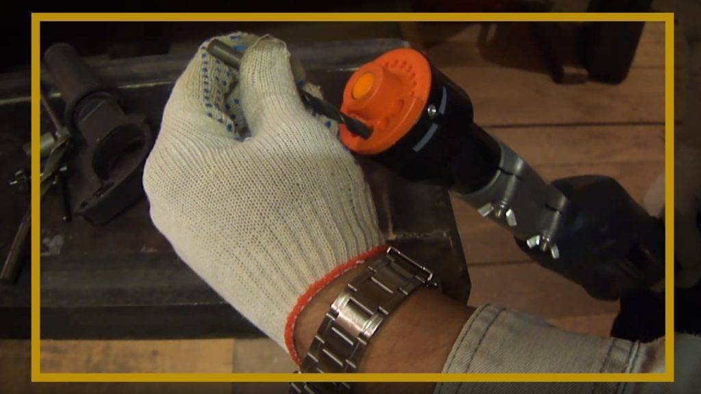 Вращение рабочей части осуществляется при помощи дрели, которая через муфту присоединяется к насадке.