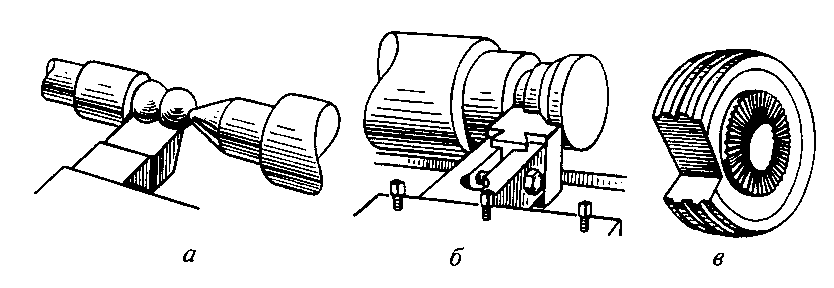 Рис. 214. Примеры применения фасонных резцов: обыкновенного (а), призматического (б) и дискового (в)