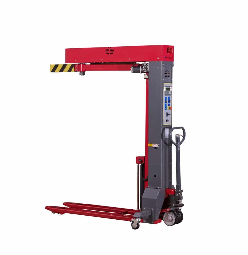 Оборудование востребовано для обустройства тесных подсобных помещений, его можно перенести непосредственно к загруженному поддону. Устройство лишено привычного опорного стола, обмотку выполняют сразу же на груз с помощью механизма, предусмотренного на мачте открытого типа Г-образной формы. Двухосный механизм, отвечающий за перемещение, активируется общим приводом агрегата.