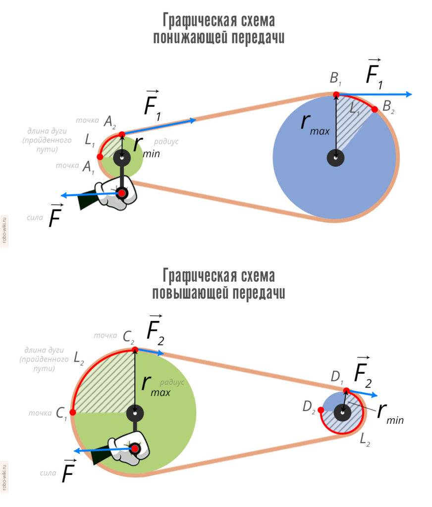 Эти схемы с понижающей и повышающей ремённой передачей наглядно демонстрируют работу золотого правила механики — за выигрыш в силе приходится платить таким же проигрышем в расстоянии (схема 1) или за выигрыш в расстоянии приходится платить таким же проигрышем в силе (схема 2).