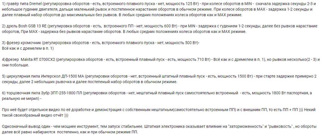 Кстати, если вы по ошибке включите болгарку или циркулярку, имеющие заводской встроенный плавный пуск в розетку, также снабженной таким УПП, то на удивление все будет работать. Единственный момент – получится задержка запуска пилы или оборотов диска на пару секунд, что не очень удобно в работе и без привычки может озадачить.