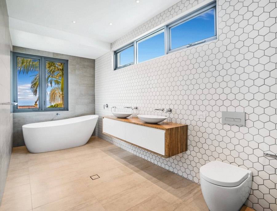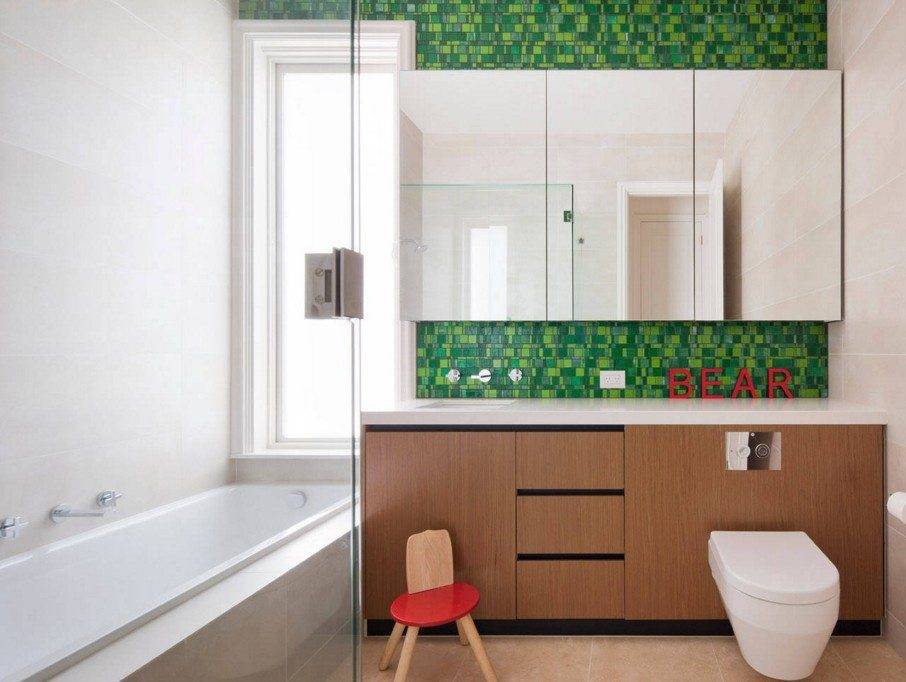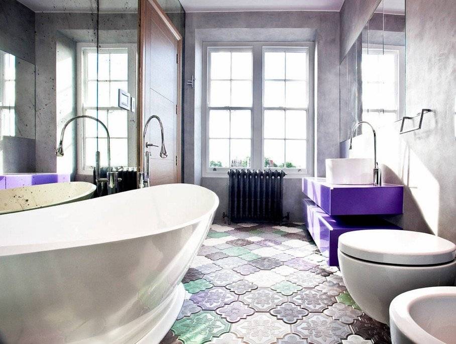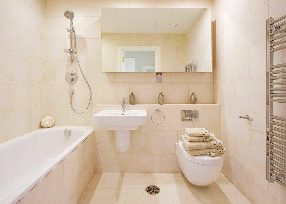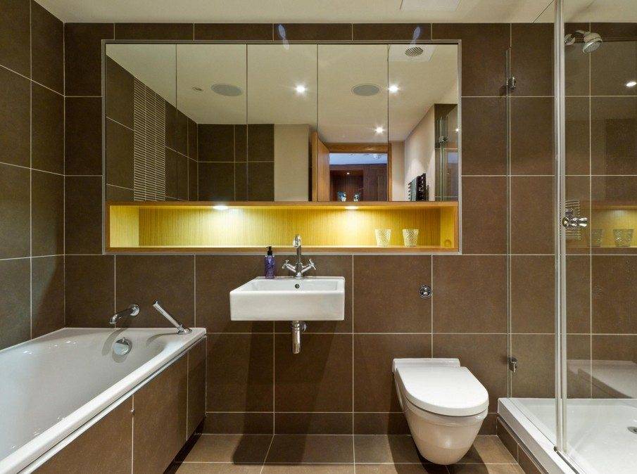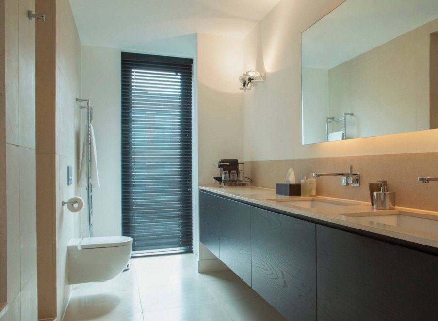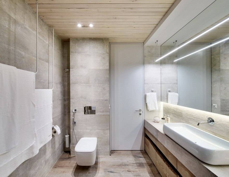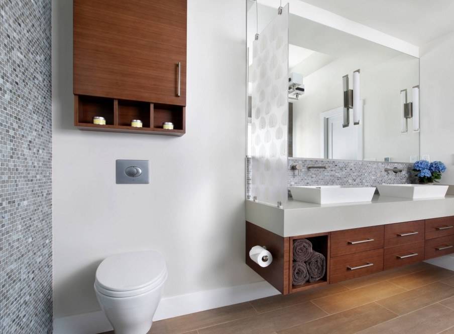 Если позволяет площадь санузла, то мелкие предметы обихода хранят в шкафчиках, а место возле унитаза остается свободным. Это важно для тех, кто учитывает стилистические особенности помещения и старается не загромождать пространство лишними вещами. Единственным украшением санитарной зоны служит коврик, создающий комфорт в ванной комнате с напольным покрытием из холодной керамической плитки