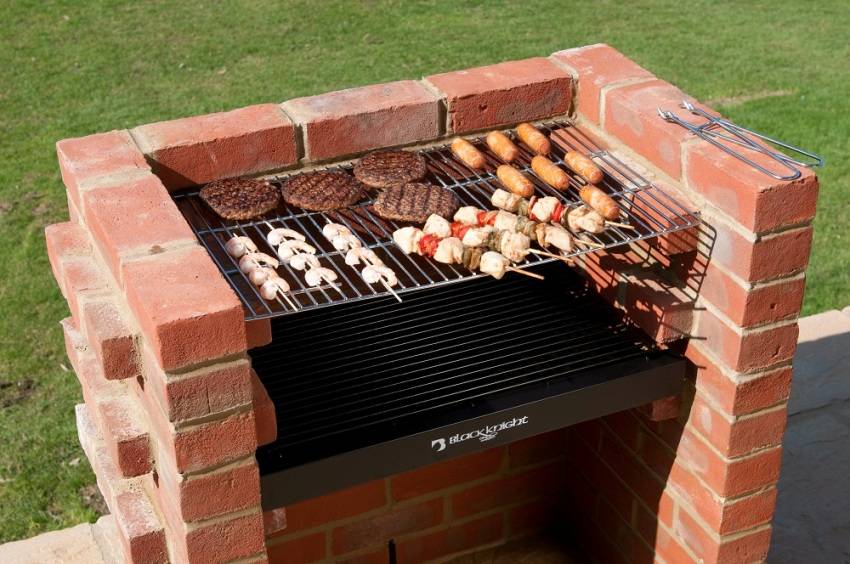 Это просто выложенный из кирпича прямоугольник. Дно может быть также выложено кирпичом – тогда золу с него придется выгребать подручными приспособлениями – или, как на фото выше, с решеткой. В этом случае необходимо предусмотреть дверцу в одной из боковых стенок (обычно она заменяет два-четыре кирпича) для выгребания золы из-под решетки. Шампуры или решетка для жарки укладываются прямо поверх кирпичных стенок.