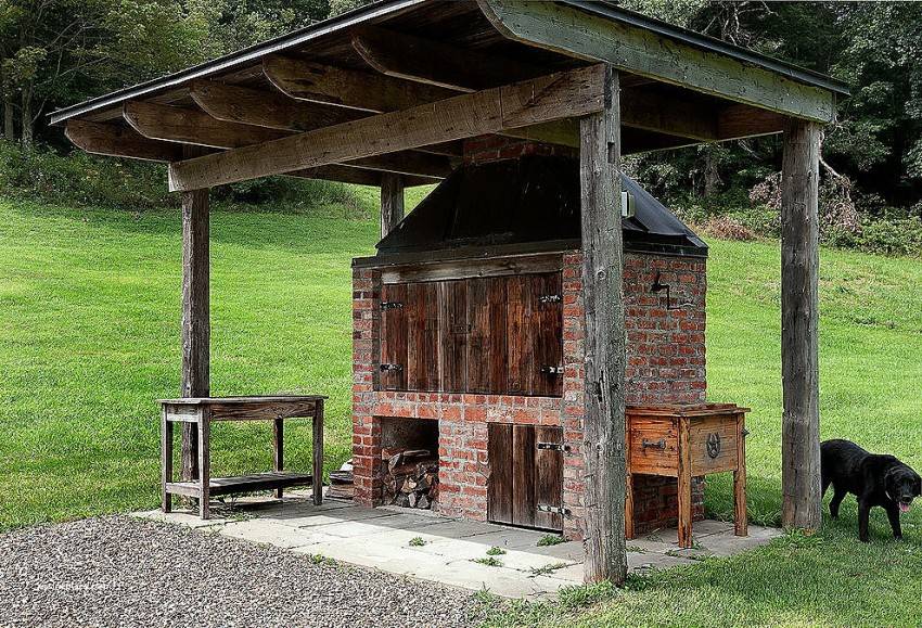 - кирпичный свод с дымоходом – для отвода дыма и защиты приготавливаемых продуктов от дождя. Кроме того, наличие свода и дымохода усиливает тягу, не дает жару от углей уходить бесцельно в стороны.