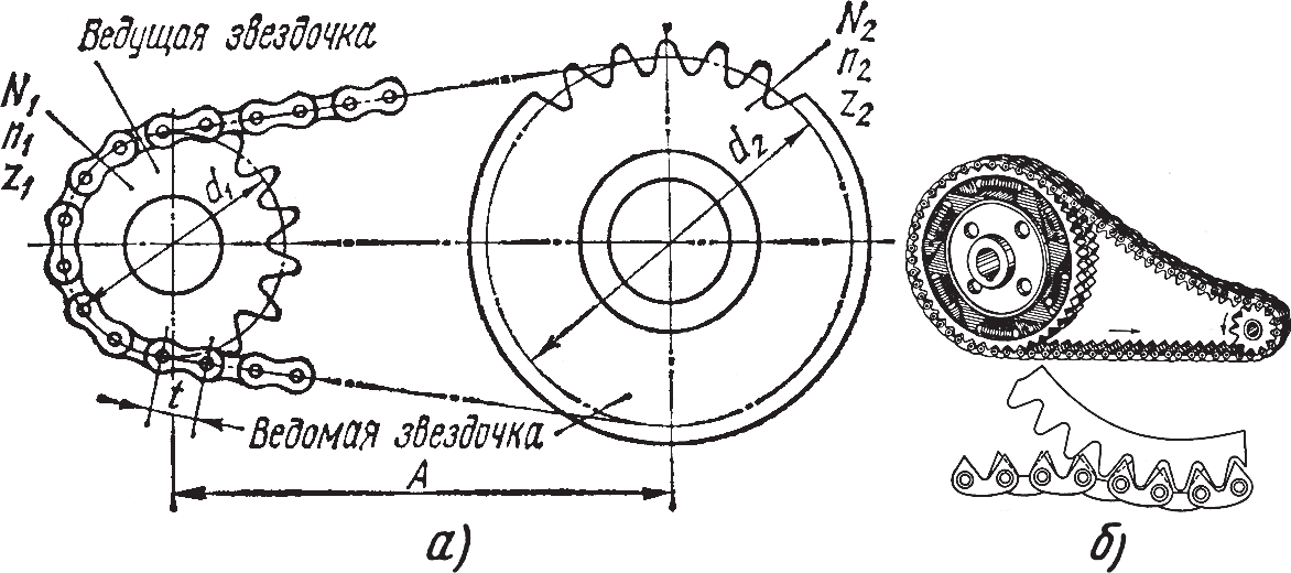 Рис. 6. Цепная передача: а – с втулочно-роликовой цепью; б – с пластинчатой цепью