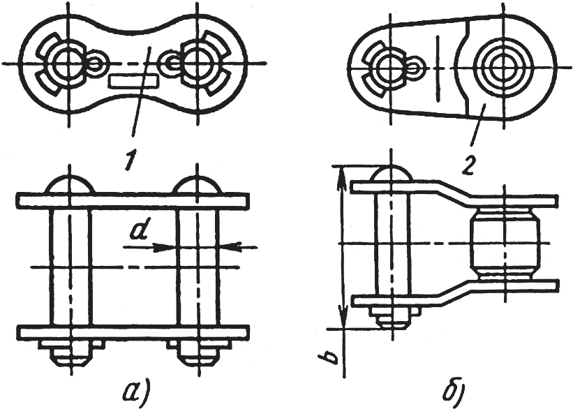 Концы отрезка цепи соединяют при помощи соединительных или переходных звеньев. Для втулочно-роликовой цепи соединительное звено представляет собой два валика, скрепленных пластинками (рис. 8, а).