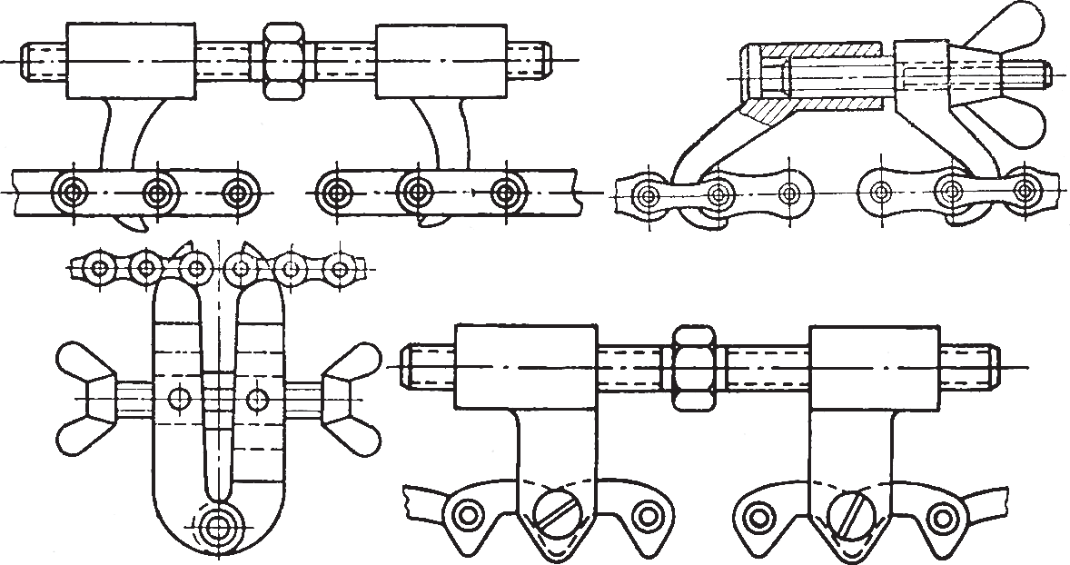 Рис. 9. Приспособления для соединения звеньев втулочно-роликовой и зубчатой цепи