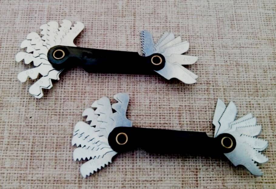 Резьбомер – это набор шаблонов, изготовленных из прочных металлических пластин. Их толщина около 1 мм. Один конец пластин имеет вырезы, калибром сопоставимые с измеряемой резьбой – шагом и профилем. Такие пластинки с зубчиками мастера называют гребенками. Метрические гребенки имеют обозначение шага резьбы, дюймовые — количество ниток помещающихся в одном дюйме.