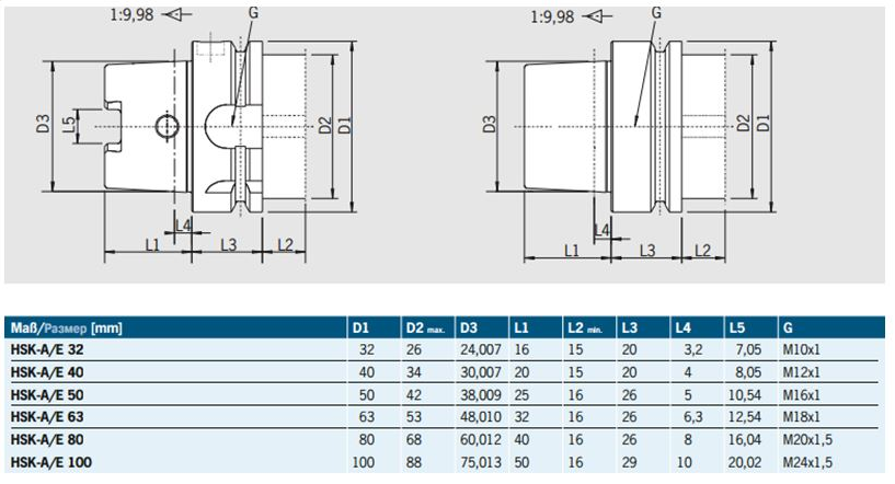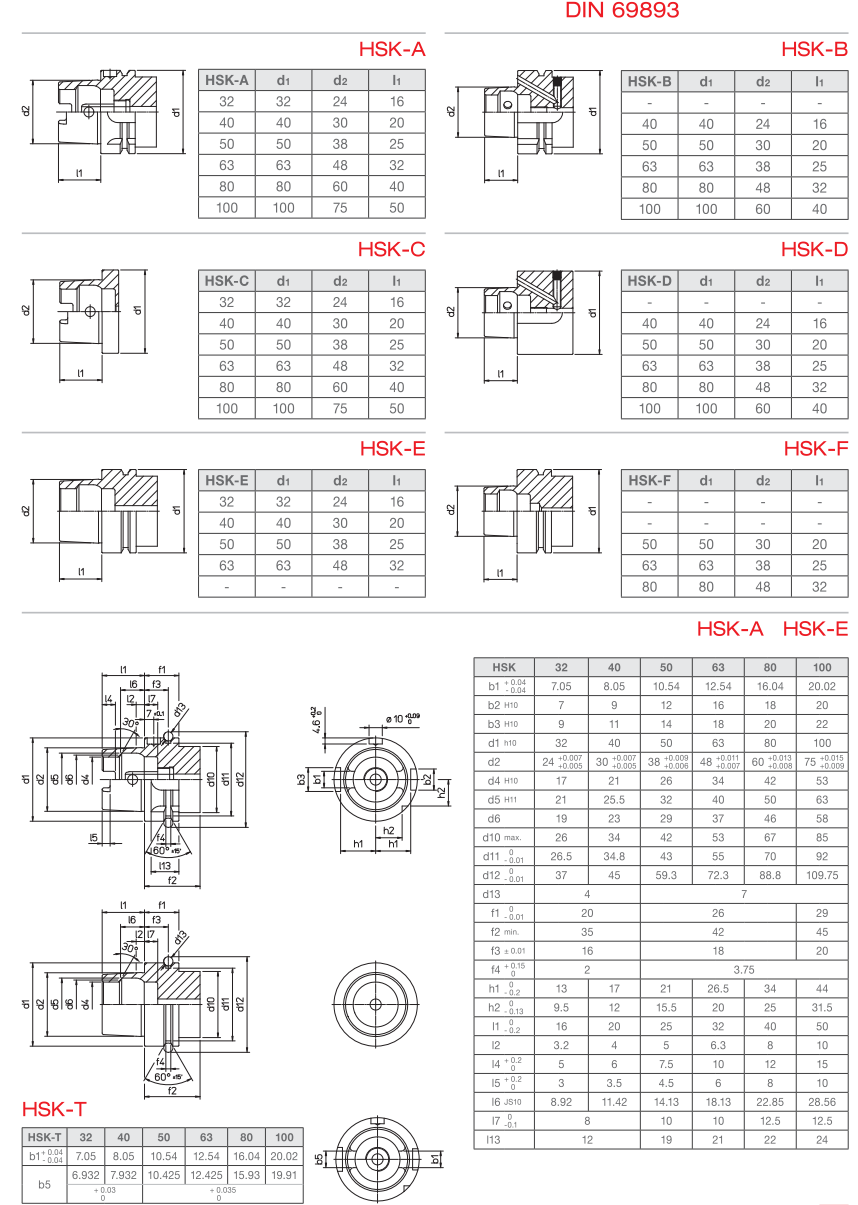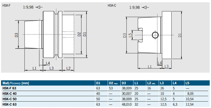 Оправки с конусами HSK типа (угол конусности 2 град., 51 мин., 78 сек., с соотношением стенок 1:10).
