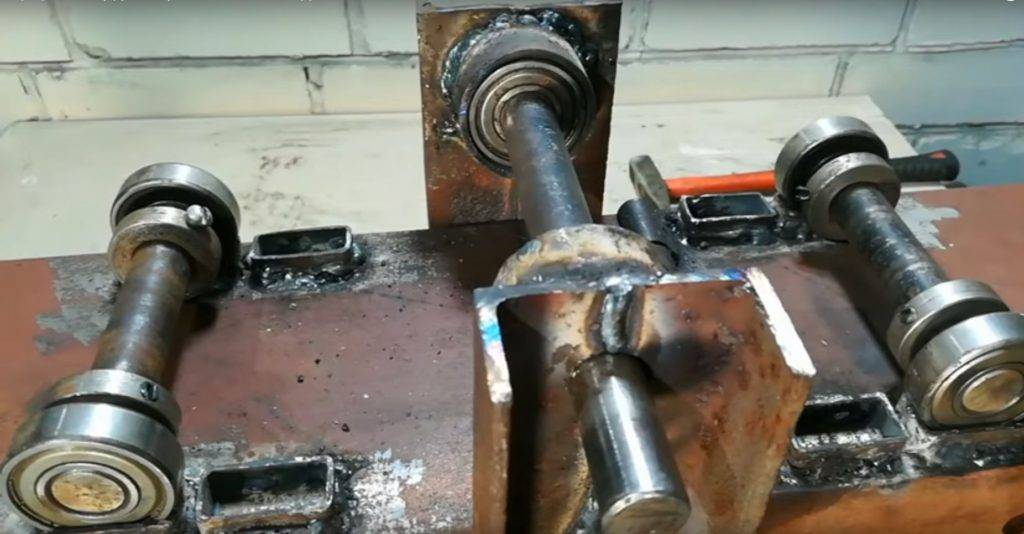 В общем и целом, собирают самодельные гибочные станки для профильных труб из того, что имеется под рукой или того, что найдут/купят недорогого. Кто имеет возможность — вытачивает ролики, вставляет подшипники. У кого такой возможности нет, используют то, что есть — вплоть до втулок от велосипедных колес. В целом надо понять конструкцию и