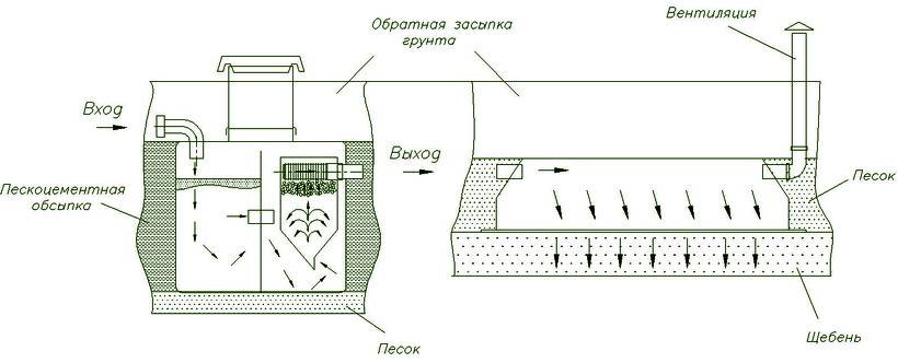 На расстоянии около полутора метров от септика выкапывается яма прямоугольной формы. На дно ямы укладывают геотекстиль. Засыпается щебневая подушка, высота которой определяется составом грунта, минимальная — 400 мм. На щебень устанавливается инфильтратор, к которому подключается труба от септика. У выхода инфильтратора устанавливается вентиляционный стояк. Конструкция утепляется изолом, затем засыпается песком.