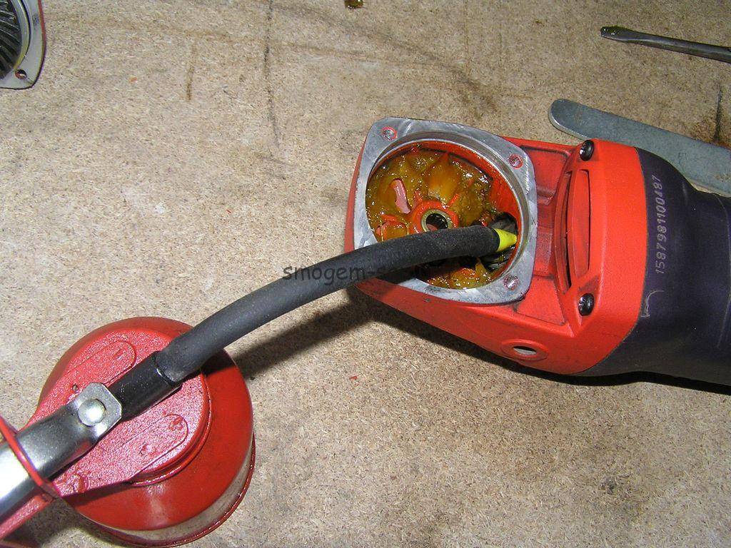 Промывая корпус редуктора, держите болгарку двигателем вверх, чтобы грязный раствор не затекал по валу ротора в его подшипник и электрические потроха.