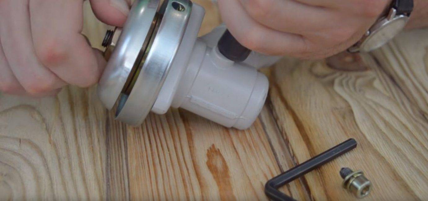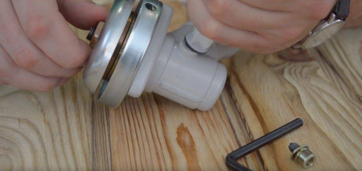 Специальным инструментом, который входит в комплект с триммером, надо вывернуть пробку редуктора.