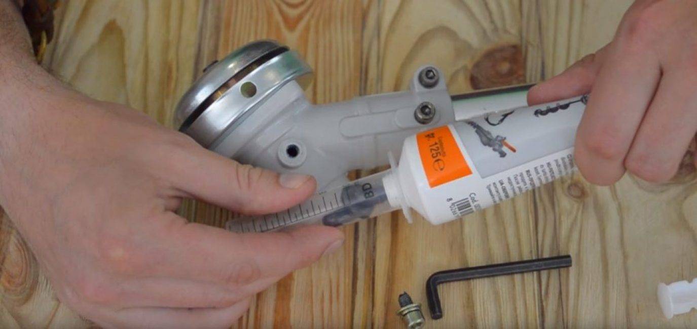В верхней части корпуса, там, где установлен блок шестерней, имеется технологическое отверстие, которое при эксплуатации триммера заглушено винтом. Этот винт выкручивается, и в отверстие при помощи носика, имеющегося на тюбике, вводится 1,5…2 мл смазки. Если смазка была приобретена в другой расфасовке, то для данной операции подойдёт и обычный одноразовый медицинский шприц.