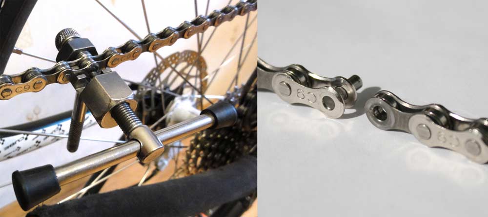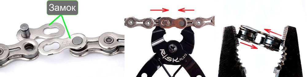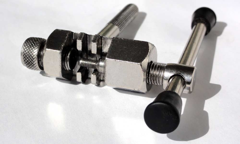 Если же цепь не имеет замка, то чтобы её разъединить, нужно будет выдавить пин (штырёк, соединяющий звенья). Проще всего это сделать так называемой выжимкой цепи: