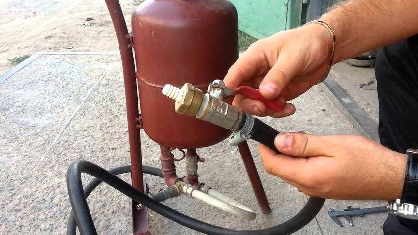 На последнем этапе компрессор соединяется со смесителем при помощи 10-миллиметрового шланга, после чего можно пробовать подключать установку и начинать эксплуатацию. Если потребуется увеличить мощность подачи песка, к емкости прикрепляется дополнительный штуцер, другой конец которого присоединяется к компрессору.
