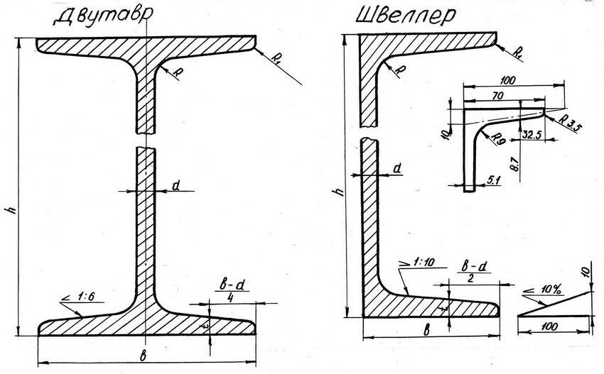 Чертеж с типовыми размерами двутавра и обычного швеллера