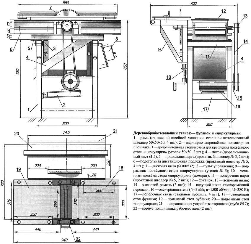 В некоторых вариантах исполнения не нужно устанавливать другие насадки. Для фрезерования, пиления, иных видов обработки достаточно перейти на соседний специализированный стол с переключением привода многофункционального бытового деревообрабатывающего станка на нужный инструмент.