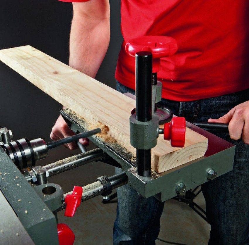 Двигатель мощностью 2,2 кВт вращает рабочий вал со скоростью 5500 об/мин. Ножевой вал оснащен тремя ножами. Максимальный диаметр сверла — 16 мм. Цена станка — 27000 руб.