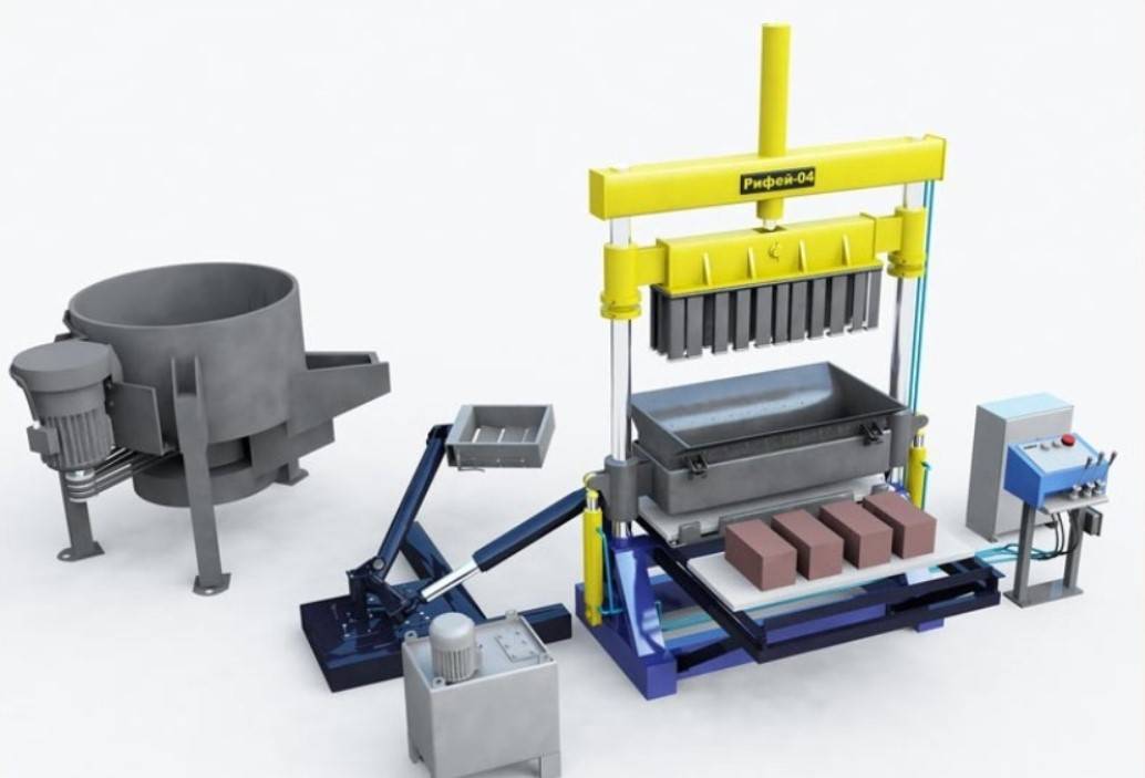 - состоит из вибропресса мощностью 21,6 кВт, смесителя, дозатора, модуля подачи поддонов, загрузчика смеси, электрошкафа, маслостанции;
