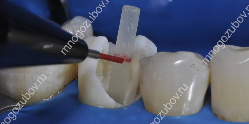 Для надежной фиксации изделия из стекловолокна врач должен сначала подготовить зуб. После окончания терапевтической части проводится депульпация (удаление нерва) и прочистка канала. Его протравливают слабым раствором фосфорной кислоты, причем ею обрабатывается не только внутренняя полость (не более 15 секунд), но и поверхность коронки (30-60 секунд). Далее зуб промывают дистиллированной водой, высушивают бумажными турундами и обрабатывают препаратом, содержащим коллагеновые волокна. Именно они должны обеспечить адгезивность изделия. После этого начинается процесс установки стержня.