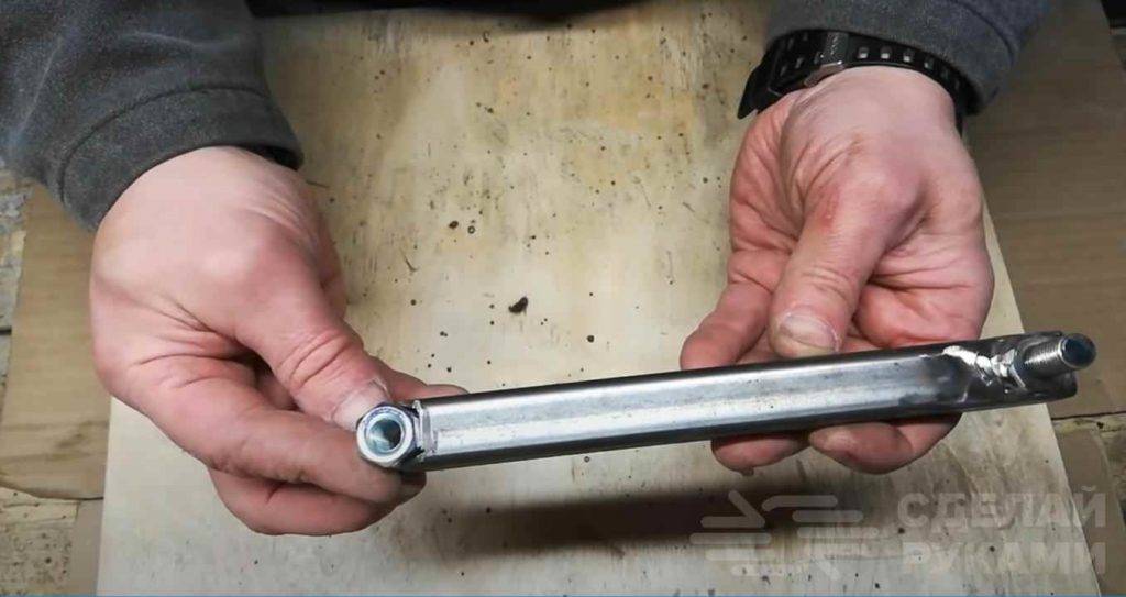 Далее необходимо изготовить еще один рычаг из профтрубы длиной 200 мм. С одной стороны профиля привариваем удлиненную гайку, с другой — болт. К длинному рычагу привариваем вторую удлиненную гайку.