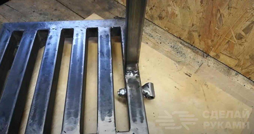 Для этого в стойке надо просверлить отверстие, в которое вставляется болт (изнутри профиля). На него накручивается удлиненная гайка. Зачищаем сварные швы и красим все элементы конструкции.