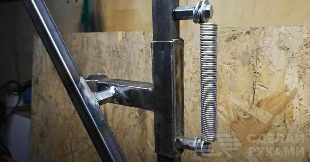На последнем этапе останется только установить дверную пружину, которая после сверления заготовки будет возвращать в исходное положение механизм для перемещения дрели. Фиксируется пружина при помощи двух удлиненных гаек и болтов.