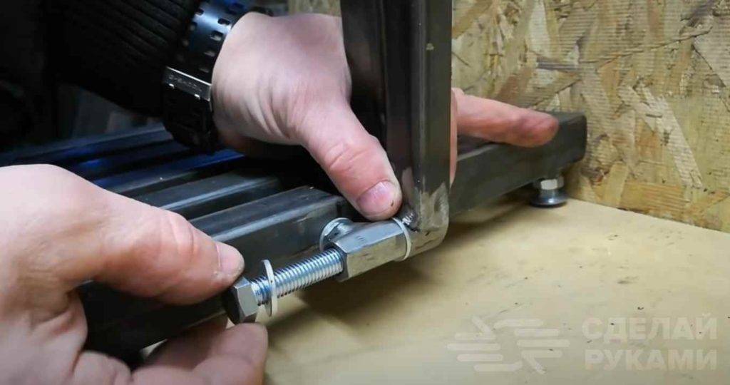 Далее необходимо будет сделать регулируемые ножки. Для этого сверлим в станине четыре отверстия по краям, и привариваем гайки. В них вкручиваем болты (они и будут выполнять роль ножек).