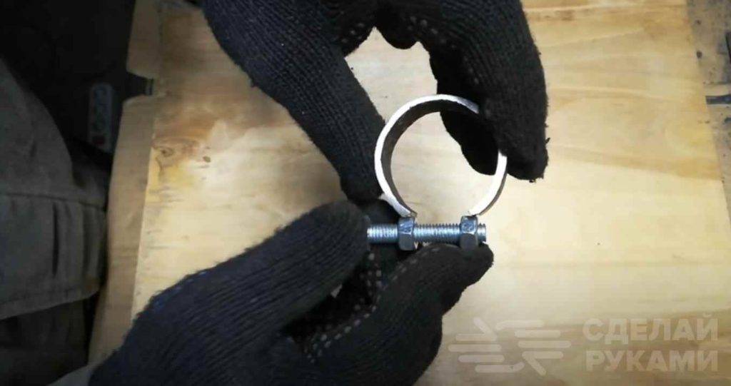 После этого необходимо изготовить хомут для крепления дрели. Его можно сделать из куска металлической круглой трубы. Разрезаем, подгоняем его по размеру, и затем привариваем две гайки.