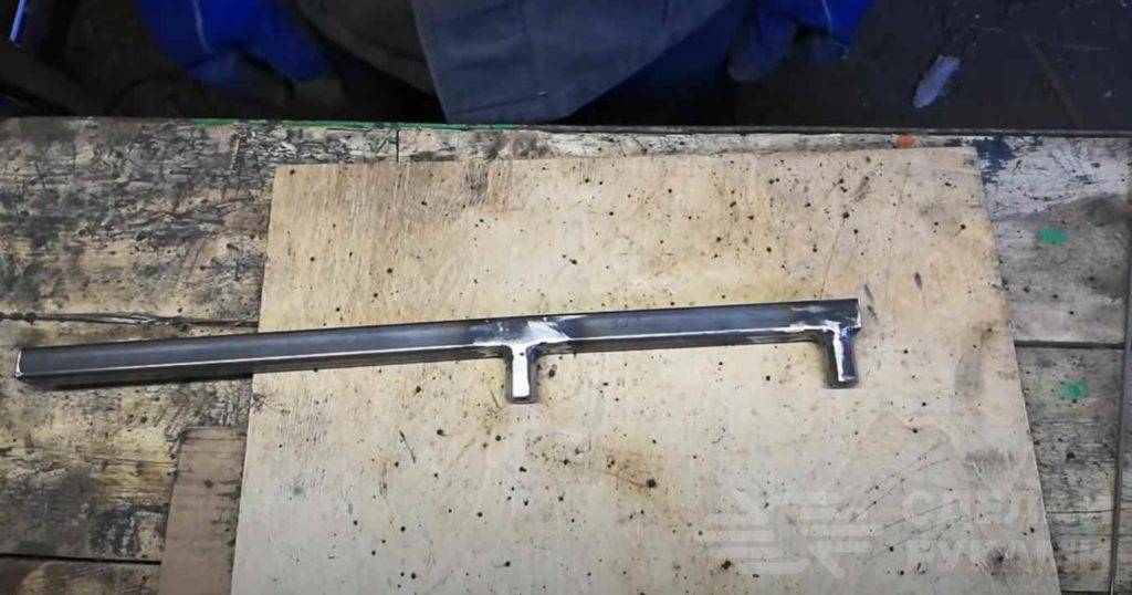 Отрезаем кусок квадратного профиля, и вырезаем на концах седловины. Потом к нему привариваем две втулки.