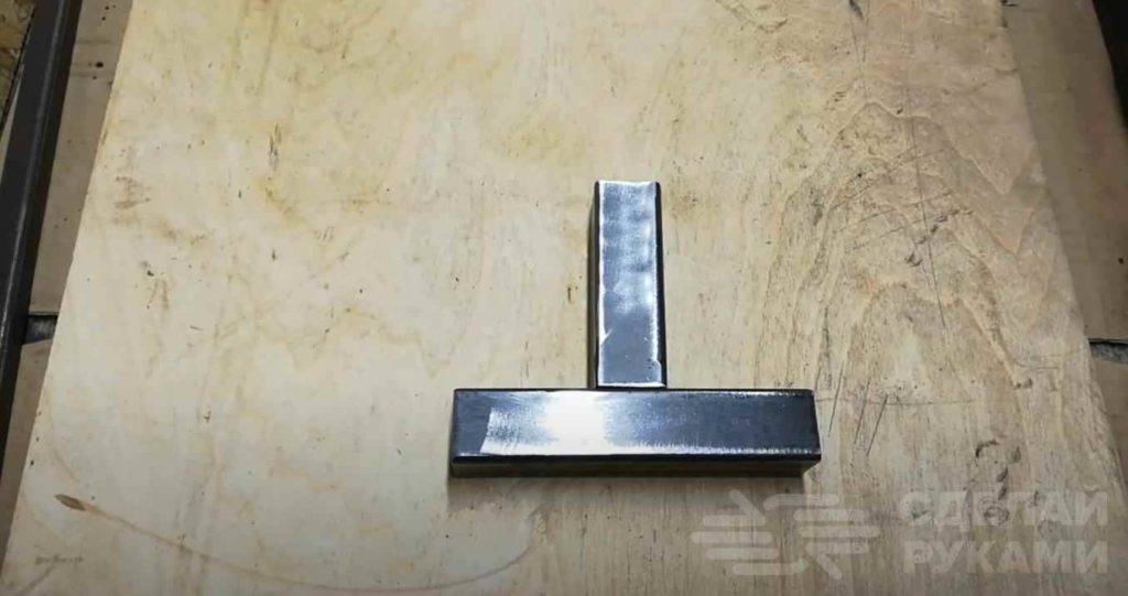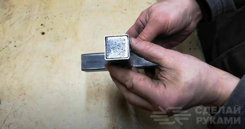 На следующем этапе изготавливаем подвижную Т-образную часть. Торцевое отверстие в коротком отрезке (держателе для дрели) надо будет заглушить. Из листового металла отрезаем кусок квадратной пластины подходящего размера, вставляем в профильную трубу, и обвариваем.