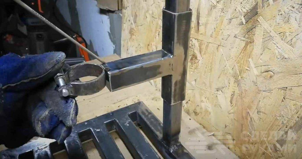 Отрезаем профильную трубу 25х25 мм (длиной 500 мм). Привариваем стойку к станине. Надеваем на нее подвижную часть. К держателю привариваем хомут.