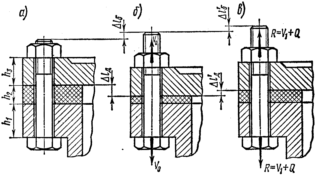 а — болт не затянут, б — болт затянут, в — к затянутому болту приложена внешняя сила Q ..