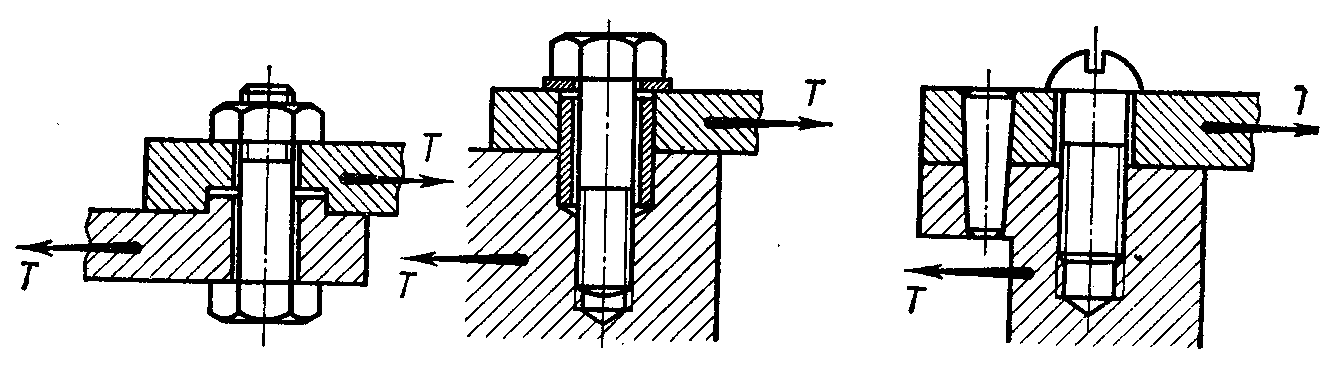 Для разгрузки болтов от поперечной силы применяют различные замки, втулки, штифты и др. (рис. 3.35). Роль болта в таких случаях сводится к обеспечению плотного соприкосновения деталей.