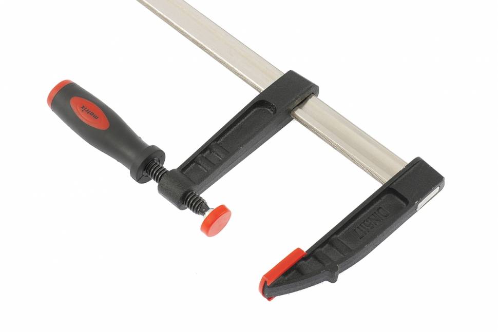 Популярная модель, которая пользуется заслуженным спросом среди отечественных потребителей во многом благодаря тому, что конструкция позволяет работать с толстыми брусьями. Заявленная производителем глубина рамы достигает отметки 10 см. Прижимной винт может отводиться на 100 мм. На торцах губок имеются удобные накладки, изготовленные из пластика. Самое хорошее решение для столярных и плотницких работ. Практически не оставляет следов на заготовках.